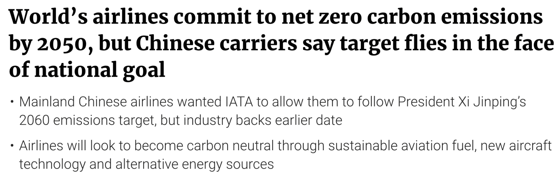 (Tạm dịch: Các hãng hàng không trên thế giới đặt mục tiêu đạt được lượng khí thải carbon bằng 0 vào năm 2050. Nhưng các hãng hàng không Trung Quốc cho rằng điều đó đi ngược lại mục tiêu quốc gia của họ.)