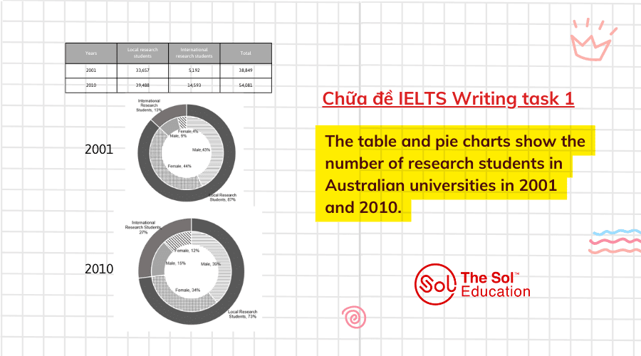 Cùng The SOL IELTS chữa đề tham khảo IELTS Writing task 1 dạng mix charts: The table and pie charts show the number of research students in Australian universities in 2001 and 2010.