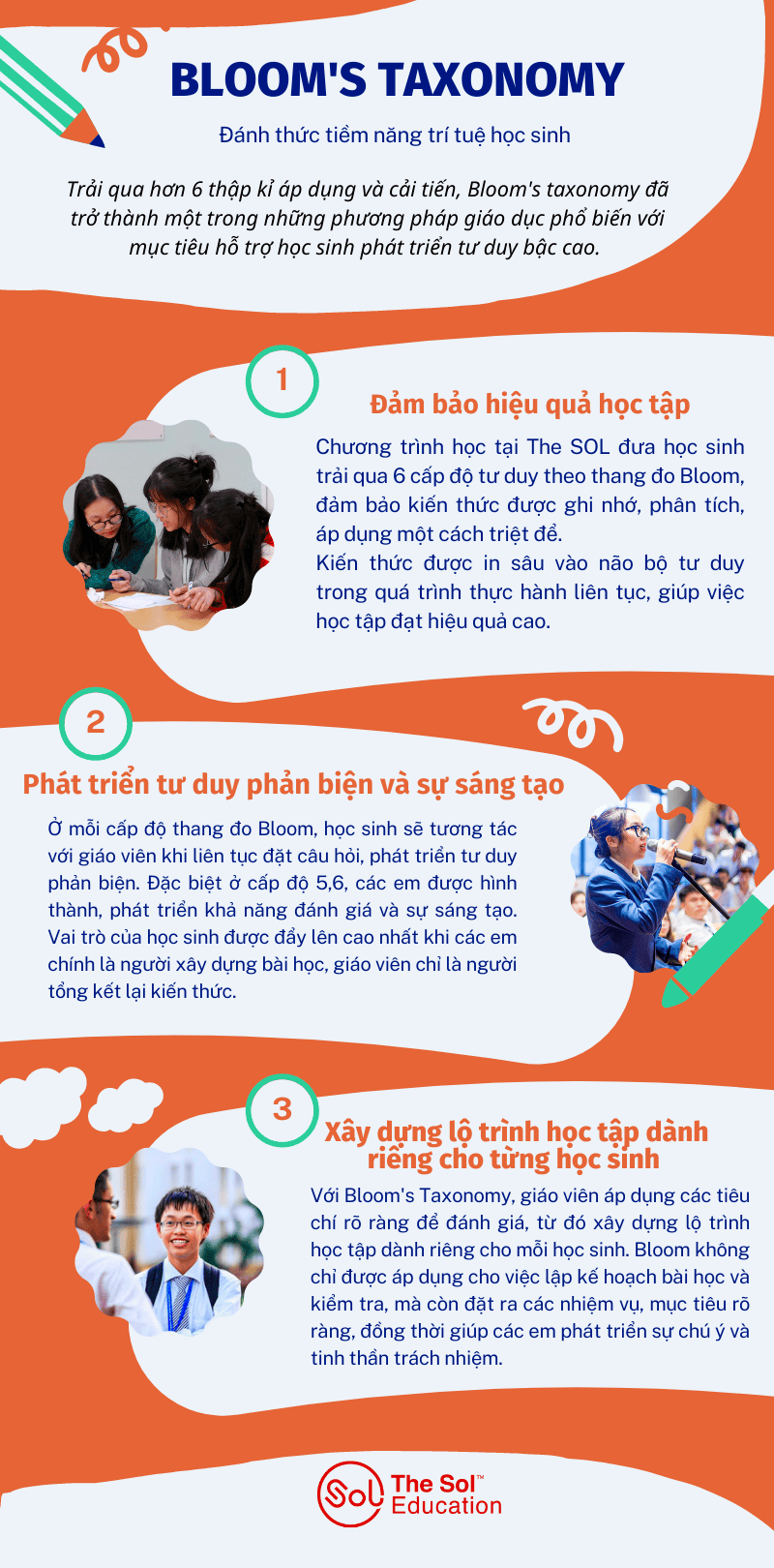 Với sự áp dụng thang đo Bloom, The SOL Education đi theo một định hướng rõ ràng từ khi xây dựng lộ trình học tập, giáo trình, các hoạt động liên quan đến phương pháp giảng dạy của giáo viên. Mô hình này giúp giáo viên xác định mục tiêu học tập chính cho học sinh trong mỗi bài học, cá nhân hóa dựa trên năng lực của học sinh. Có thể hiểu đơn giản như sau: