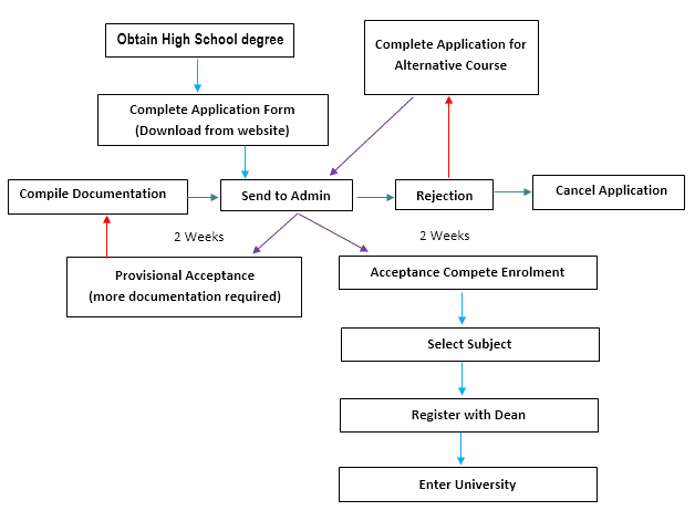 The diagram depicts a sequential process outlining the various steps a high school graduate can take to enrol in a university.