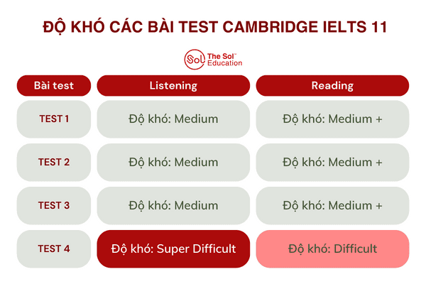 Về độ khó của các bài test trong sách Cam 11, các bạn có thể tham khảo bảng đánh giá này nhé: