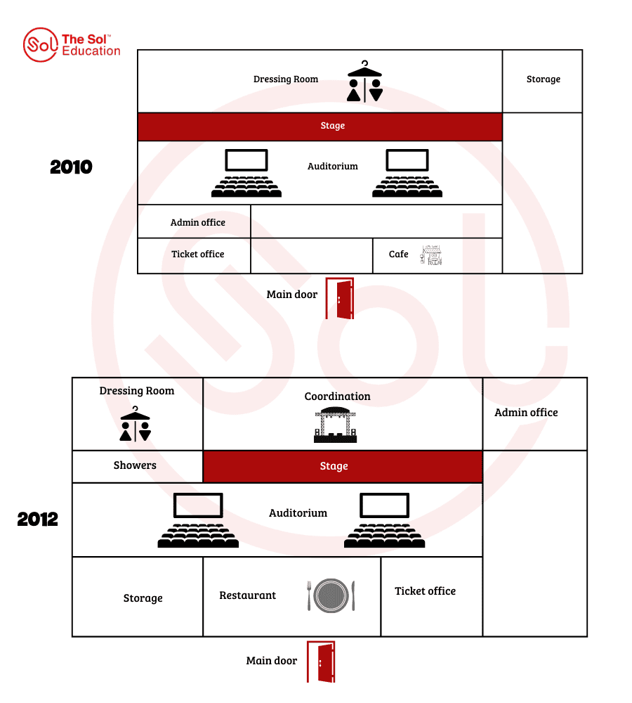 - Task 1: The plans below show a theatre in 2010 and 2012. Summarise the information by selecting and reporting the main features and making comparisons where relevant.