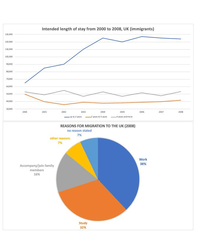 - Task 1: (Mix Pie + Line): The graph and chart give information about the migration to the UK between 2000 and 2008. The line graph shows the intended length of stay of immigrants. The pie chart shows the reasons for migration to the UK in 2008.