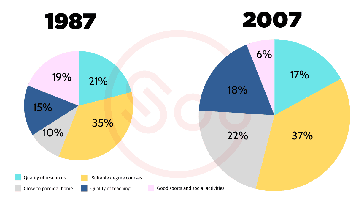 The pie chart below shows the main reasons why students chose to study at a particular UK university in 1987 and 2007. Summarise the information by selecting and reporting the main features, and make a comparison where relevant.
