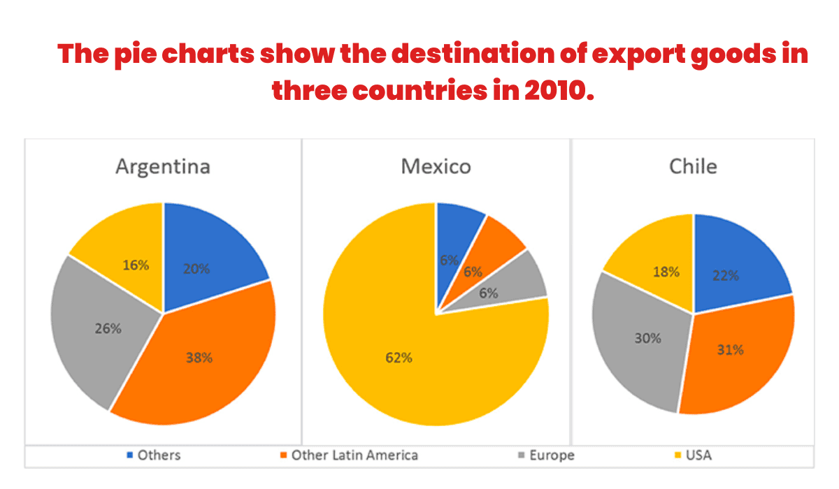 - Task 1: The pie charts show the destination of export goods in three countries in 2010.