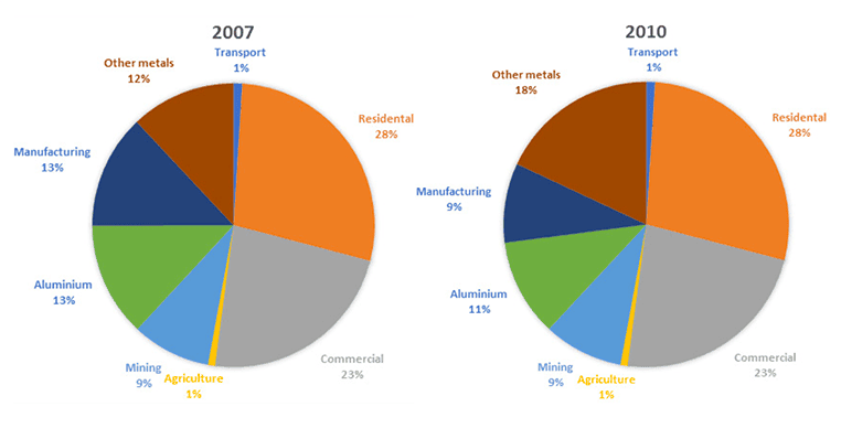- Task 1: The charts below show the percentage of electricity consumed by different sectors in Eastern Australia in 2007 and 2010.