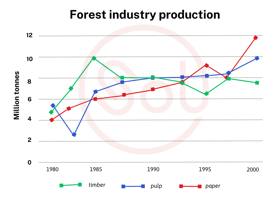 - Task 1: The graph below shows the production of three forest industry products in a European country, namely timber, pulp, and paper from 1980 to 2000.