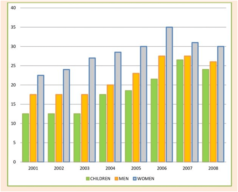 - Task 1: The chart below shows the percentage of people who ate five portions of fruit and vegetables per day in the UK from 2001 to 2008.