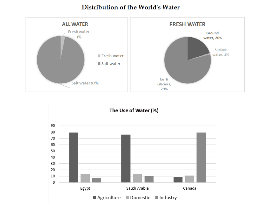 - Task 1: The charts below show the distribution of the world's water and the use of water in three countries.