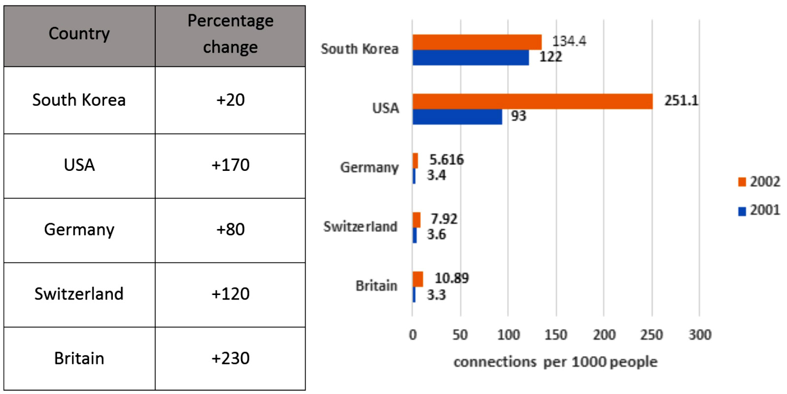 - Task 1: The chart below gives information about the high-speed continuous internet connection of households in five countries in 2001 and 2002.