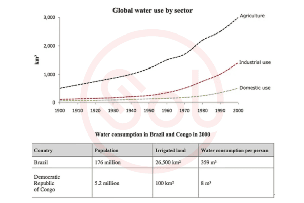 - Task 1: (Mixed-chart) The graph and table below give information about water use worldwide and water consumption in two different countries. Summarise the information by selecting and reporting the main features, and make comparisons where relevant.
