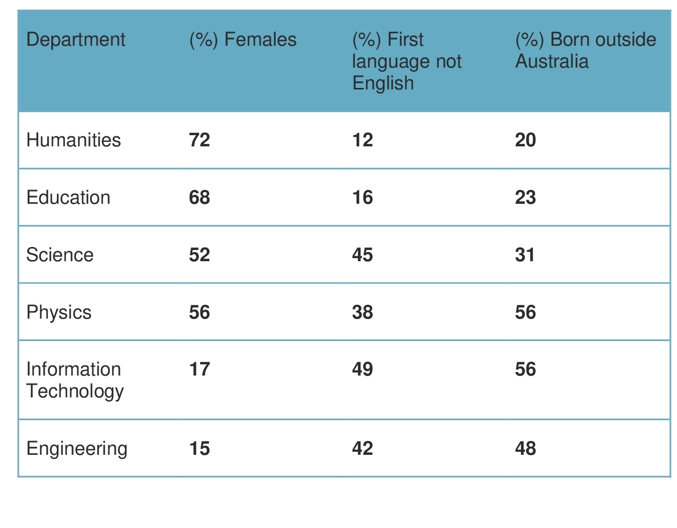 - Task 1: (Table) The table below gives information about students studying in six departments in an Australian university in 2011.