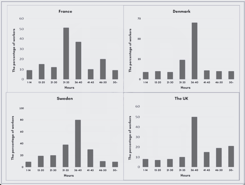 France is the only country where half of the industrial workforce worked 31 to 35 hours every week, while the majority of workers in other countries preferred to work 36-40 hours.To be specific, 70% of workers in Denmark spent 36 to 40 hours per week working, while the data for the the the the the UK was approximately 50%. The highest figure in this category, however, belonged to Sweden, at approximately 80%