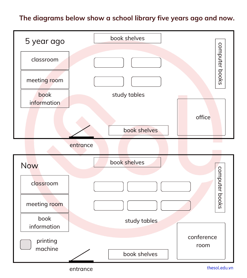 The diagrams below show a school library five years ago and now. Summarize the information by selecting and reporting the main features, and make comparisons where relevant.
