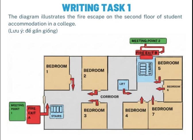The diagram illustrates the fire escape on the second floor of student accommodation in a college.