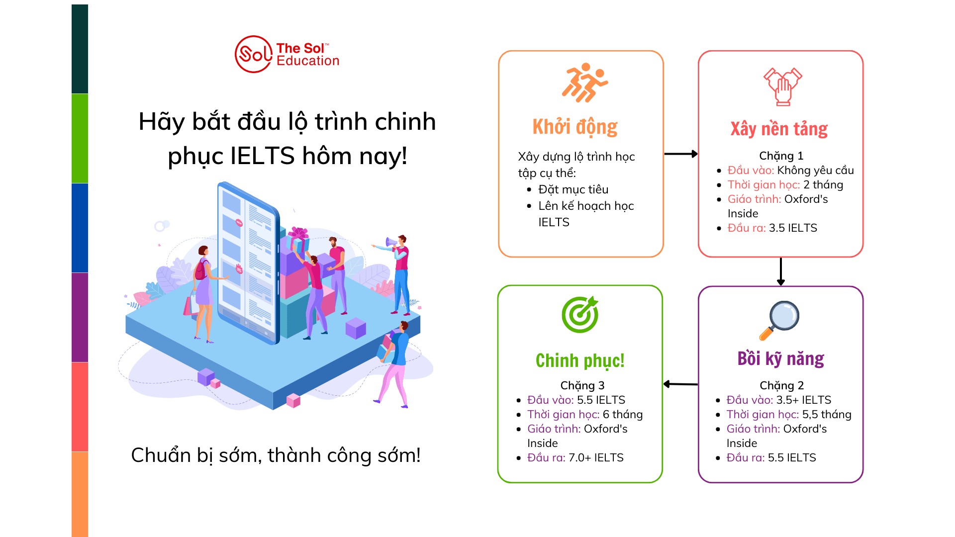Tham khảo thêm lộ trình đào tạo IELTS chất lượng cao tại The SOL, lớp học sĩ số nhỏ, linh hoạt hình thức đào tạo online, offfline và cam kết đầu ra: