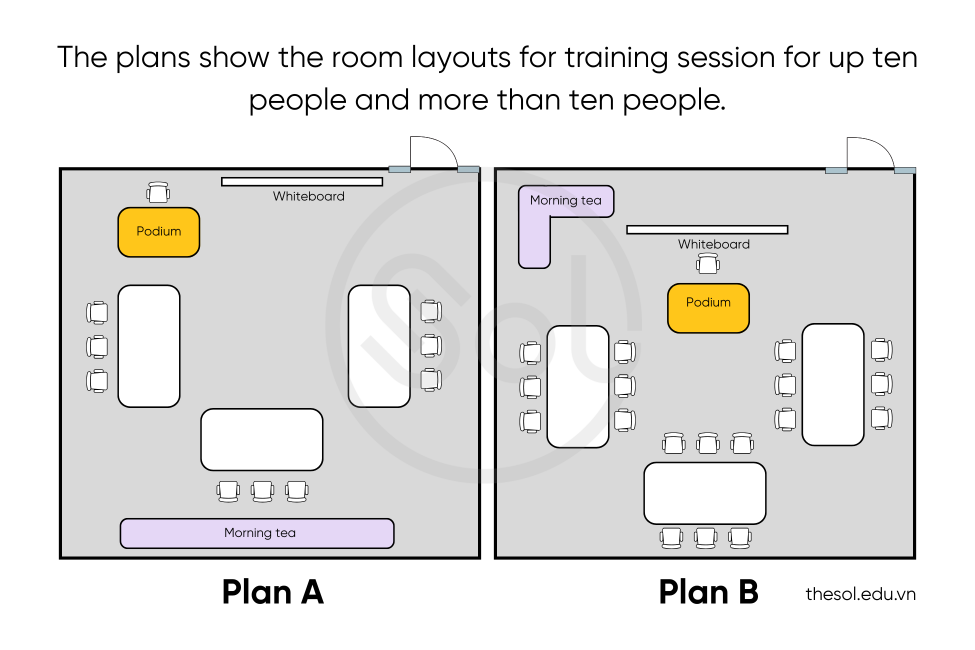 The plans illustrate two ways in which a room can be arranged to accommodate up to ten people and more than ten people in a training session. To be specific, plan A gives information on the former, while plan B shows the latter.