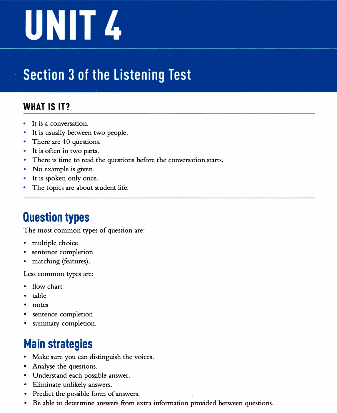 Kỹ năng Listening: Cuốn sách giới thiệu cực kì chi tiết về phần thi Nghe của bài thi IELTS, trong đó chia thành 4 section riêng biệt. Mỗi bài học đều có hướng dẫn, câu hỏi minh họa, kèm theo chiến lược làm bài cho từng dạng bài trong phần thi này. Ở kỹ năng này, cuốn sách cung cấp cho chúng ta: