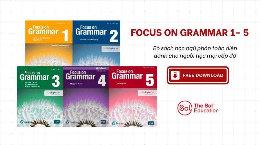 Ngữ pháp là một trong những nền tảng quan trọng trong việc học tiếng Anh, giúp bạn có thể sử dụng tiếng Anh một cách hiệu quả nhất. Hiện nay có rất nhiều sách học ngữ pháp trên thị trường nên người học cũng có vô vàn lựa chọn khác nhau. Trong bài viết này, The SOL Education sẽ giới thiệu với các bạn 1 bộ sách gồm 5 cuốn – Focus on grammar. Bộ ebook này sẽ giúp bạn làm chủ ngữ pháp tiếng Anh cũng như sử dụng tiếng Anh một cách tự tin trong giao tiếp. Tải ngay về học nhé!