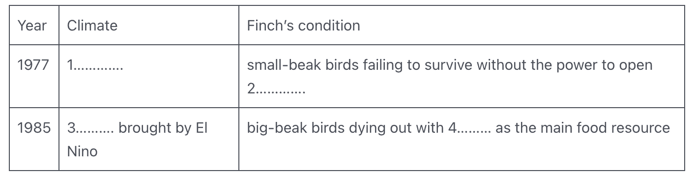 Tám năm sau, những trận mưa lớn do El Nino mang lại đã biến đổi thảm thực vật vốn thường cằn cỗi trên Daphne Major. Cây nho và các loại cây khác vốn đấu tranh sinh tồn trong nhiều năm đột nhiên phát triển mạnh mẽ, bóp nghẹt những cây cung cấp hạt lớn cho chim sẻ. Những hạt giống nhỏ dần chiếm ưu thế trong nguồn cung cấp thực phẩm, và những con chim lớn có mỏ to bị chết với tỷ lệ cao hơn những con nhỏ hơn. 'Có thể quan sát được sự chọn lọc tự nhiên/ Rosemary Grant nói. 'Nó xảy ra khi môi trường thay đổi. Khi các điều kiện địa phương tự đảo ngược thì hướng thích ứng cũng thay đổi theo.'