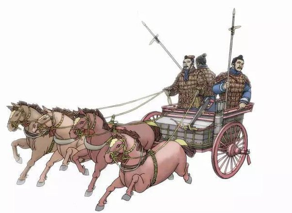 (Tuy nhiên, trong vòng một thiên niên kỷ, các nhà sản xuất xe ngựa Trung Quốc đã phát triển một phương tiện có trục, tiền thân của xe ngựa hoặc xe kéo thực sự. Thiết kế này không xuất hiện ở châu Âu cho đến khi kết thúc Đế chế La Mã. Vì các trục xe cong lên trên và dây đai ép vào vai ngựa chứ không phải cổ nên cỗ xe có trục hoạt động cực kỳ hiệu quả. Cây kích cũng là một phần của vũ khí tiêu chuẩn dành cho xe ngựa. Cây kích này thường dài hơn 3 mét, điều đó có nghĩa là một chiến binh đánh xe cầm nó sang một bên có thể hạ gục người đánh xe đang đi ngang qua. Tốc độ của xe được thử nghiệm trên cát khá nhanh. Với tốc độ cao, những đường chuyền này rất nguy hiểm cho người điều khiển cả hai cỗ xe.)