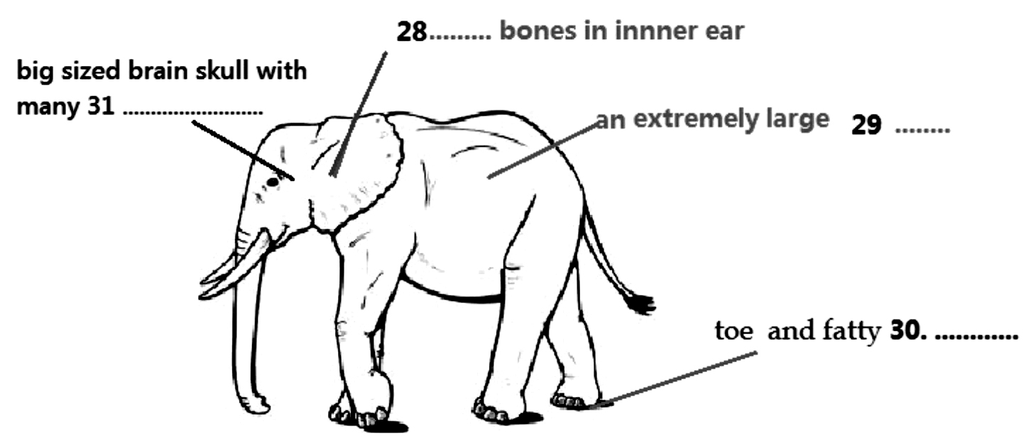 How the elephants sense these sound vibrations is still unknown, but O'Connell-Rodwell, a postdoctoral researcher at Stanford University, proposes that elephants are 'listening' with their 32________ by two kinds of nerve endings that respond to vibrations with both 33________ frequency and slightly higher frequencies. O'Connell-Rodwell's work is at the combination of geophysics, neurophysiology and 34________ . It was known that seismic communication existed extensively within small animals, but O'Connell-Rodwell was the first person to indicate that a large land animal would send and receive 35________ too. Also, he noticed the freezing behaviour by putting a male planthopper on a stem and play back a female call, which might prove the existence of other communicative approaches besides 36________. Scientists have determined that an elephant's ability to communicate over long distances is essential, especially, when elephant herds are finding a 37________ , or are warning of predators. Finally, the results of our 2002 study showed us that elephants could detect warning calls through the 38________.