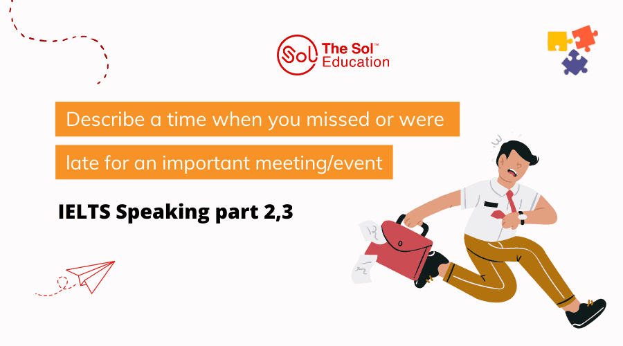 Đã bao giờ bạn bị trễ một buổi họp hoặc một sự kiện quan trọng chưa? Nếu gặp câu hỏi này trong phần thi IELTS Speaking part 2, bạn sẽ trả lời như thế nào? Cùng tham khảo câu trả lời của SOL cho đề bài Describe a time when you missed or were late for an important meeting/event và chuẩn bị thật tốt cho phần thi IELTS Speaking của bạn nhé.