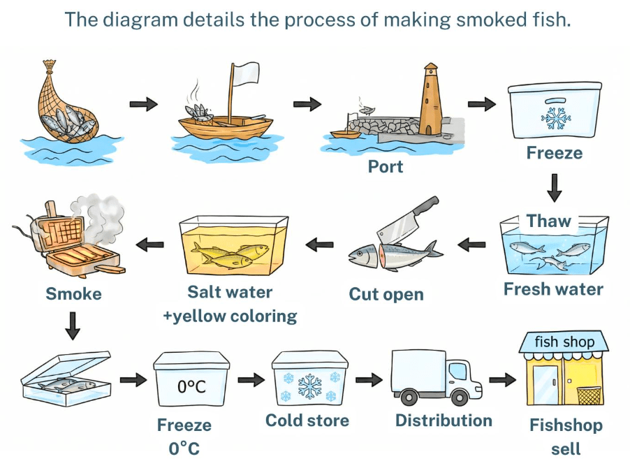 Chữa đề IELTS Writing task 1 đề bài The diagram details the process of making smoked fish. The diagram details the process of making smoked fish IELTS Writing task 1 sample.