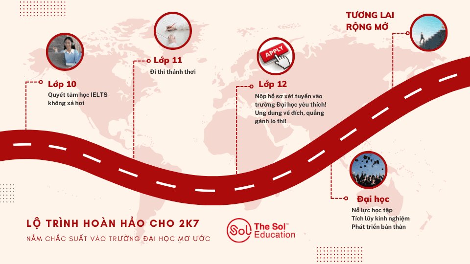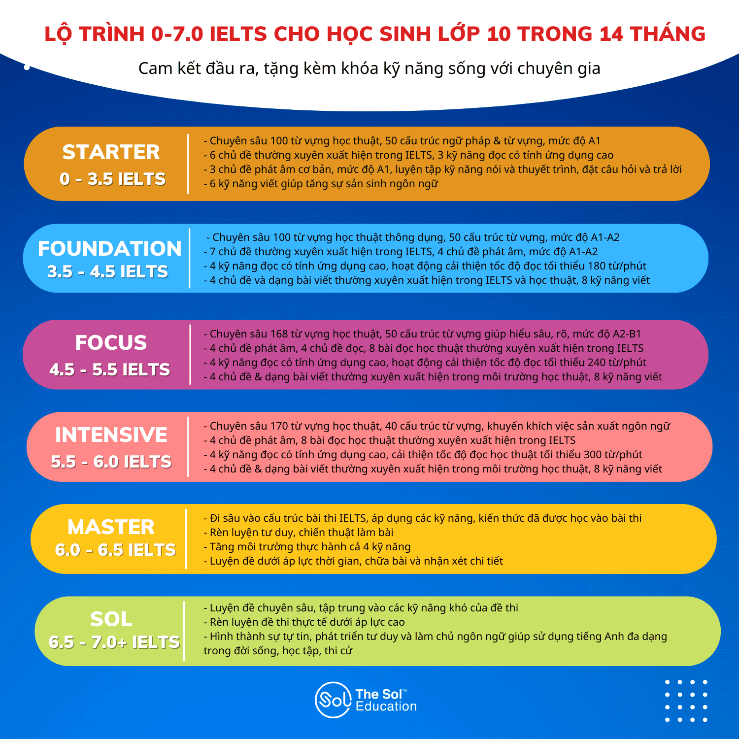 Các bạn 2k8 có thể tham khảo lộ trinh chinh phục 7.0 IELTS, làm chủ ngôn ngữ, phát triển kỹ năng của The SOL Education dưới đây nhé: