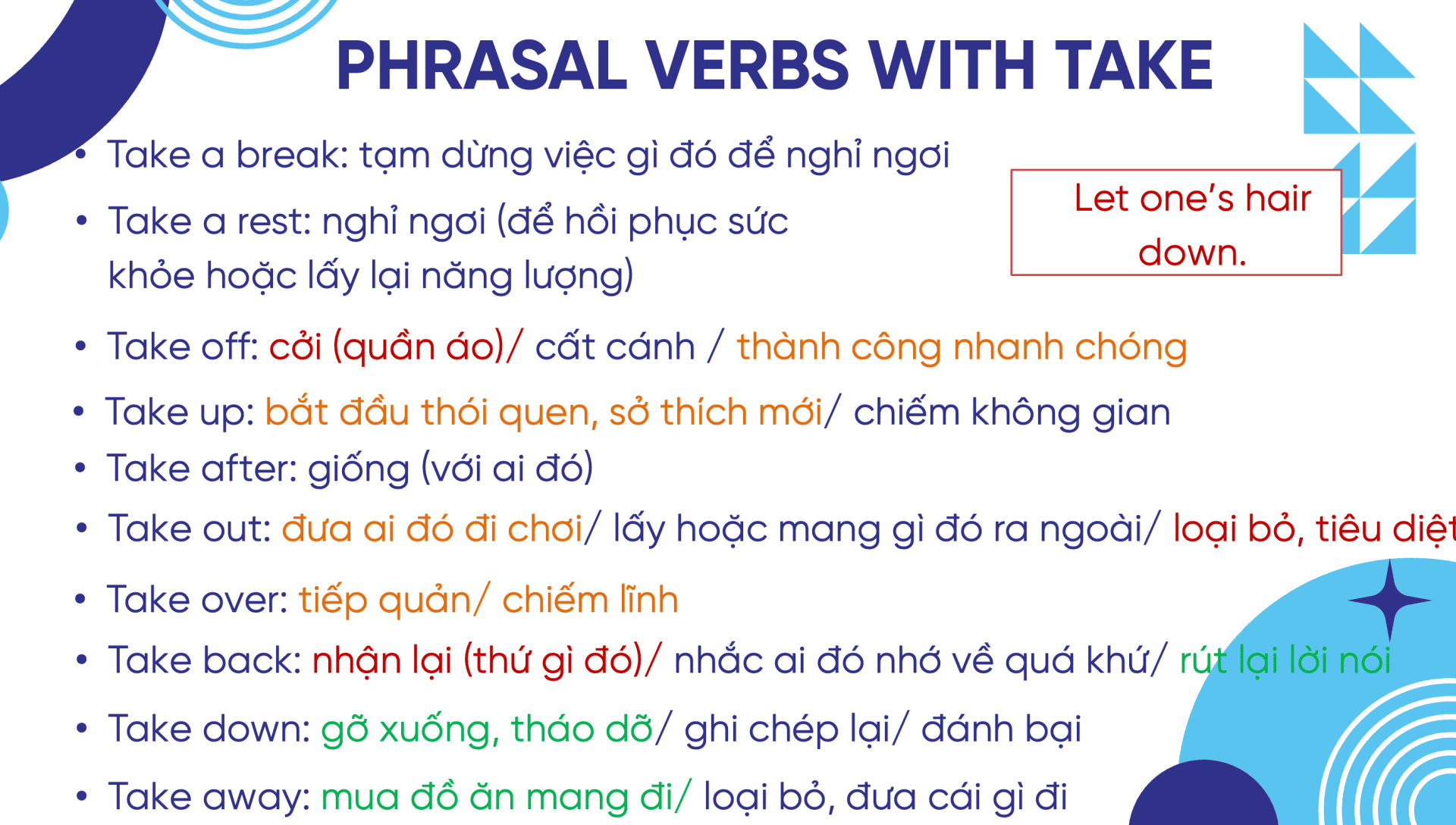 | Take out | Mang đi, lấy ra | Let’s take out some food tonight. |