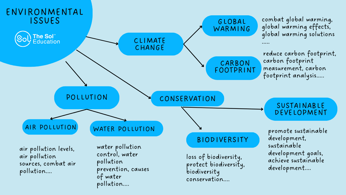 Chúng ta sẽ cùng xây dựng 1 sơ đồ tư duy khi học từ vựng IELTS cho topic "Environmental Issues" (Vấn đề môi trường) nhé.