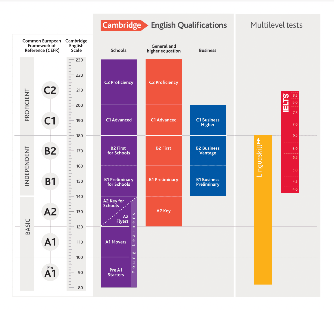 Bảng năng lực ngôn ngữ một số kì thi - Nguồn: Cambridge.org