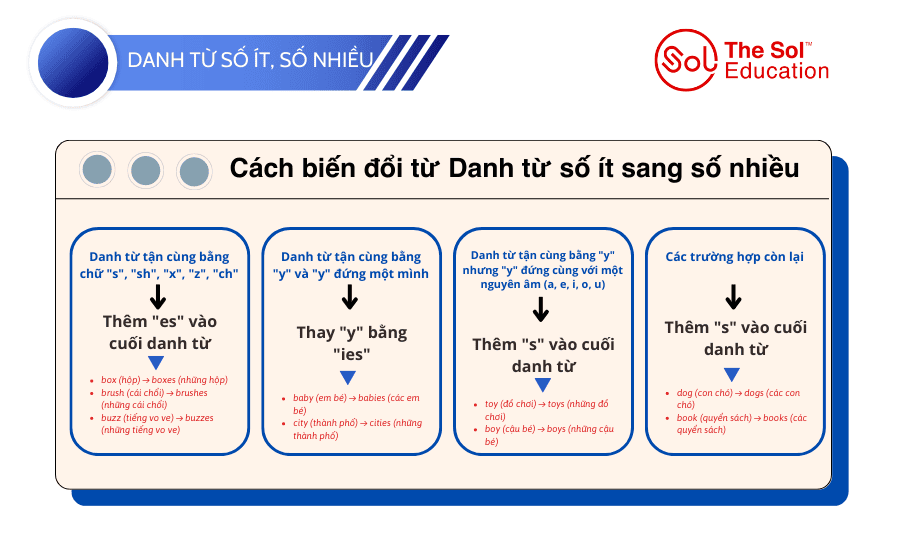 Để biến đổi danh từ từ số ít sang số nhiều, chúng ta sẽ áp dụng như sau: