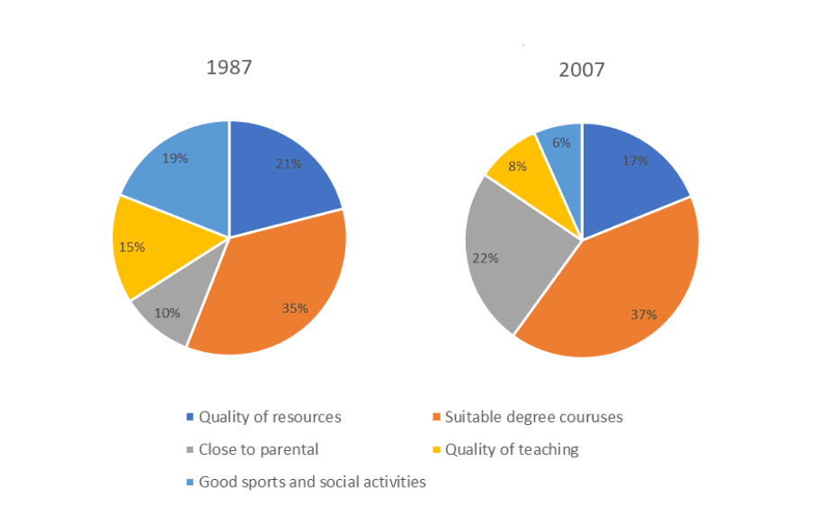 - Task 1: The pie chart below shows the main reasons why students chose to study at a particular UK university in 1987 and 2007. Summarize the information by selecting and reporting the main features, and make a comparison where relevant.