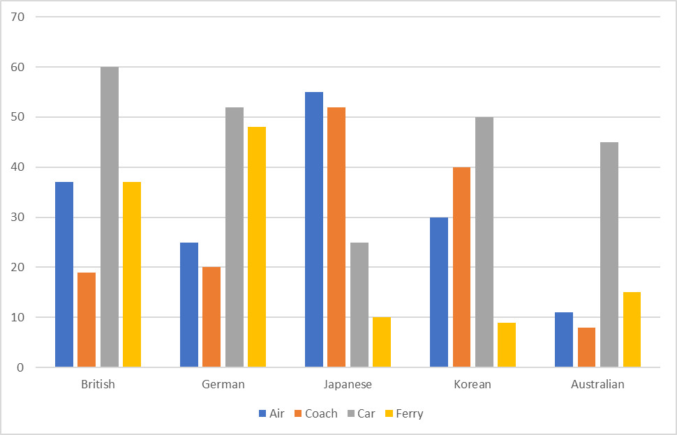 - Task 1: The graph below shows the types of transport used by tourists who visited New Zealand from five countries in 2004.