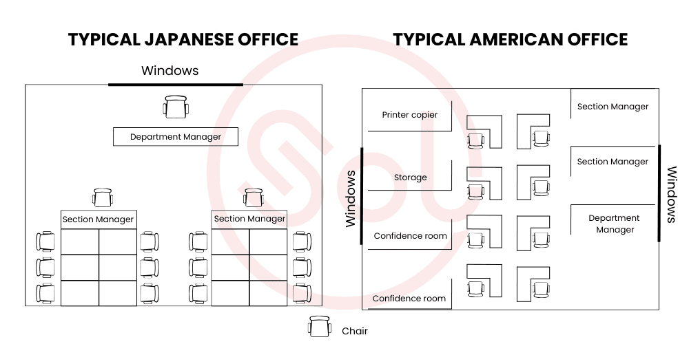 The graph below shows a typical American and a Japanese office. Summarise the information by selecting and reporting the main features and comparisons where relevant.