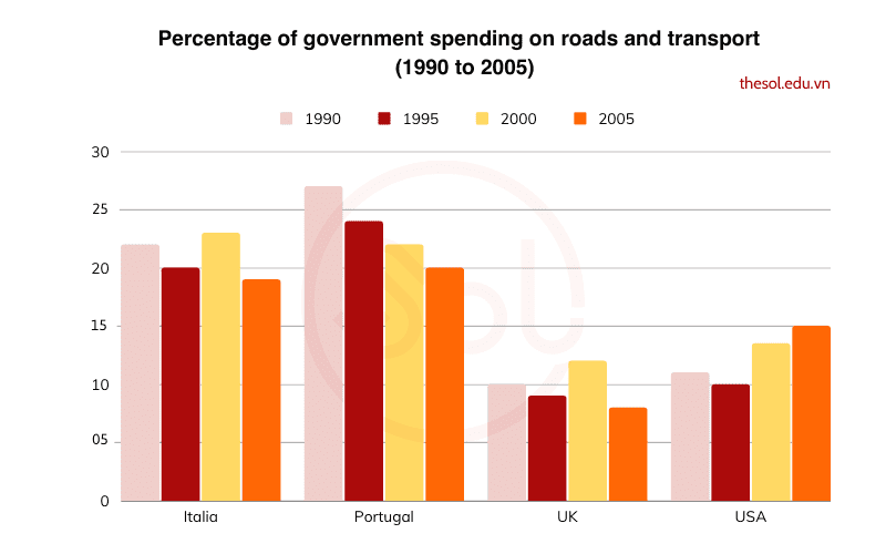 - Task 1: The chart below shows the percentage of government spending on roads and transport in four countries from 1990 to 2005.