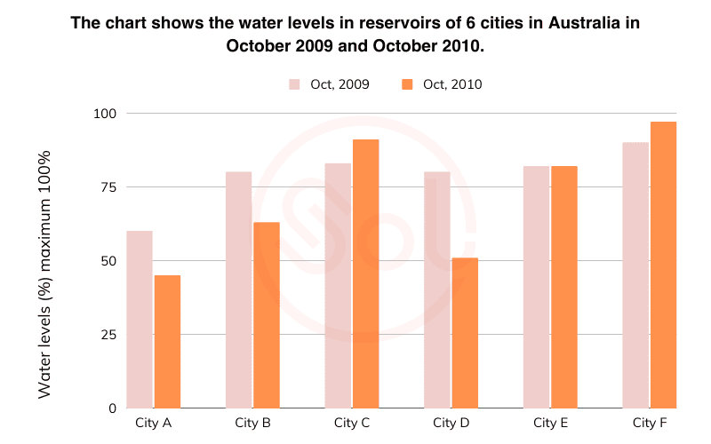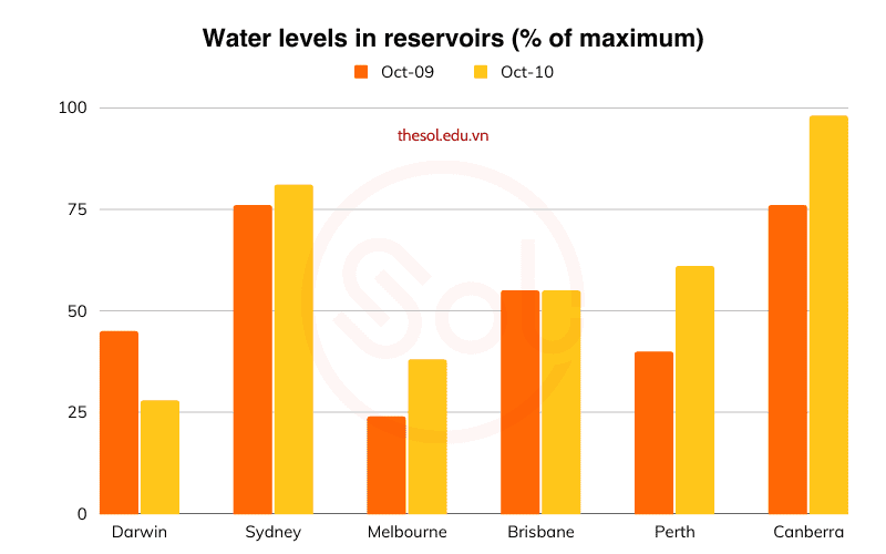 - Task 1: The chart shows the water levels in reservoirs of 6 cities in Australia in October 2009 and October 2010.