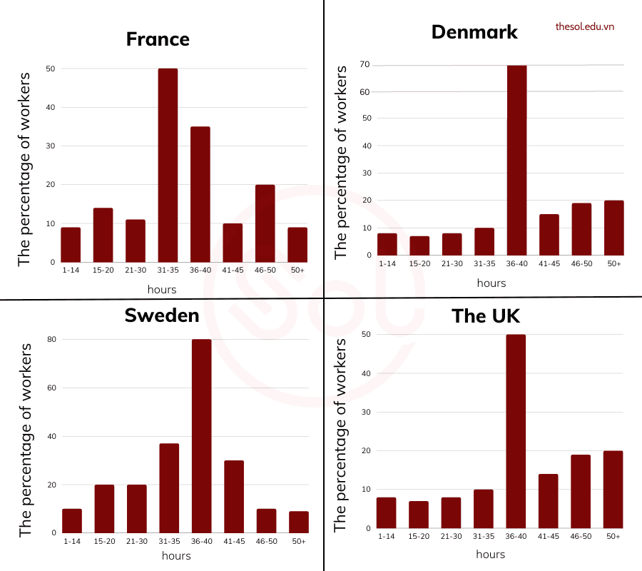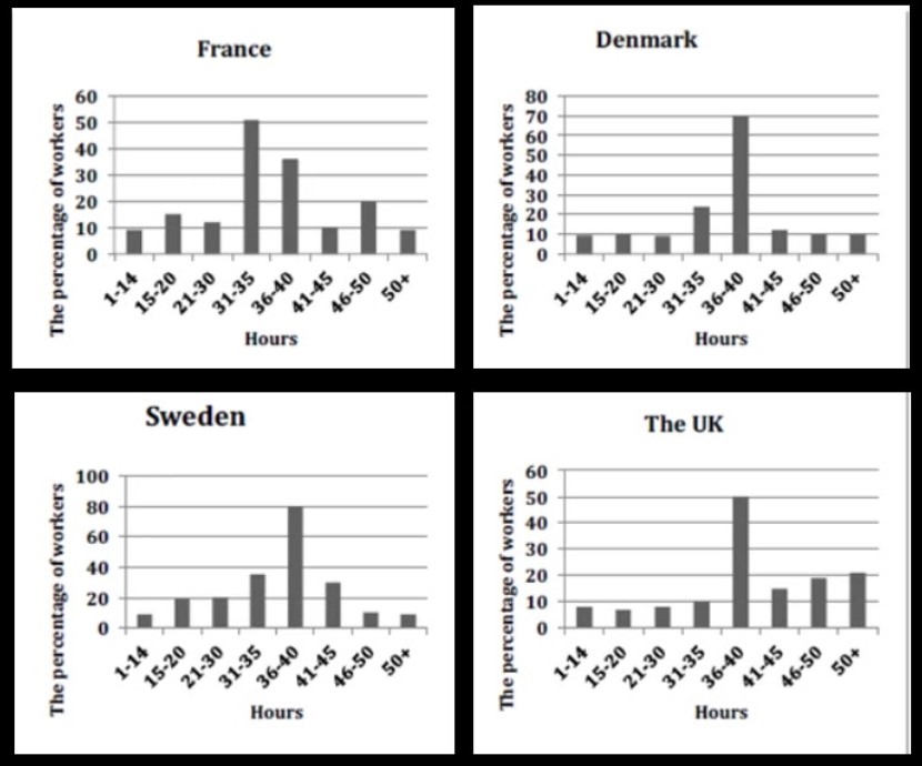 - Task 1: The charts below show the figure for work hours per week in the industrial sector in four European countries in 2002. Summarize the information by selecting and reporting the main characteristics, and compare with the corresponding ones.