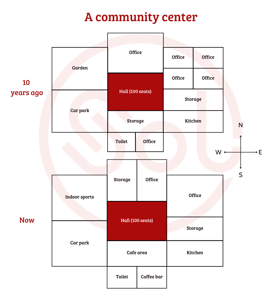 - Task 1: The maps show the changes of a community center 10 years ago and until the present.