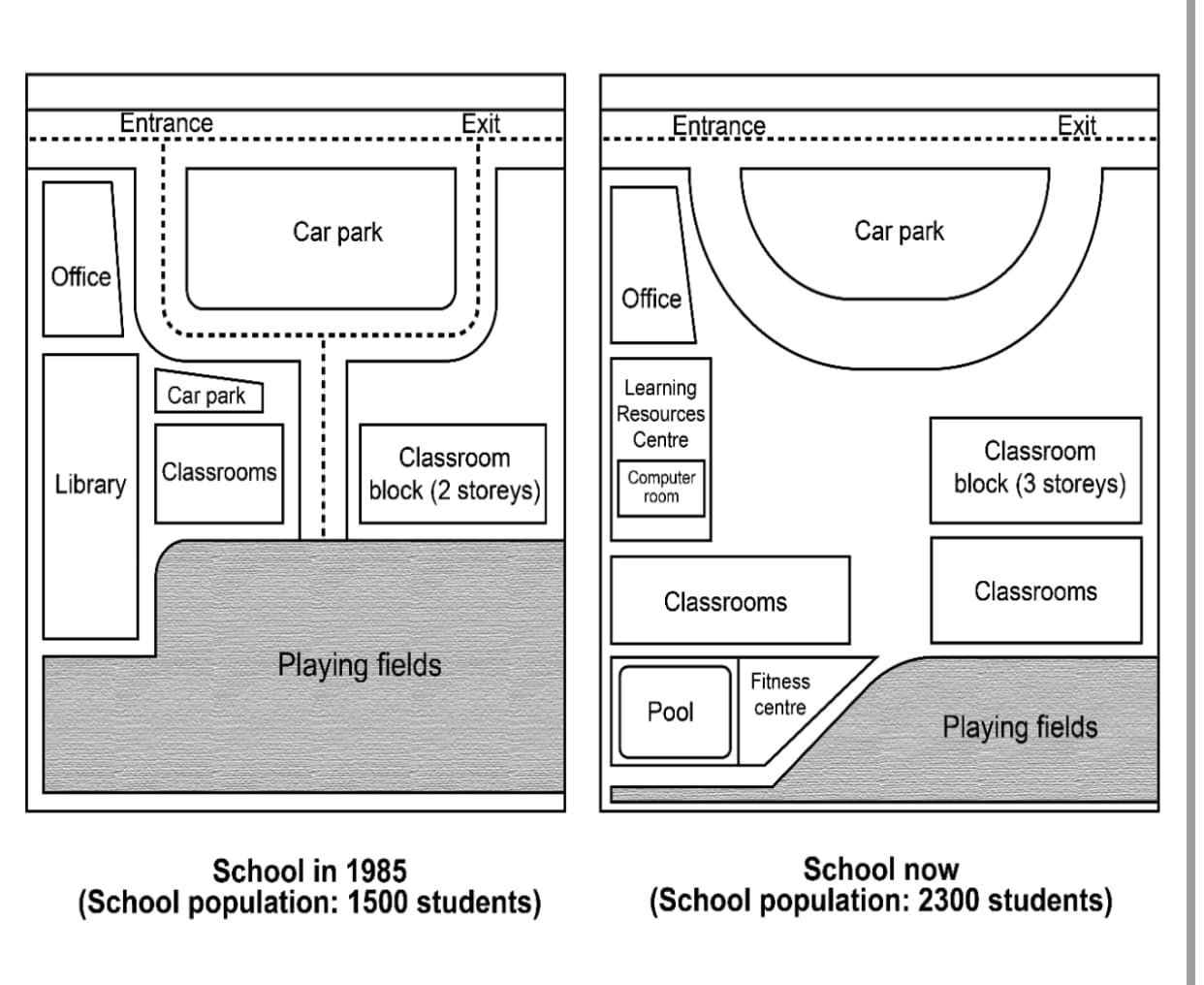 - Task 1: The maps below show the changes of a school from 1985 to present time.
