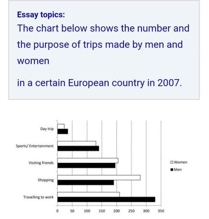 - Task 1: The chart below shows the number and the purpose of trips made by men and women in a certain European country in 2007.