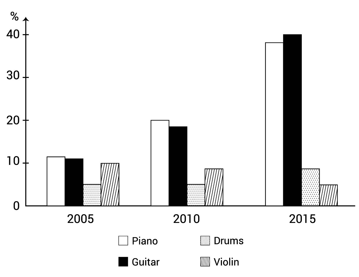 - Task 1: The bar chart shows the percentage of school children learning to play different musical instruments in 2005, 2010, 2015. Summarize the information by selecting and reporting the man features and make comparisons where relevant.