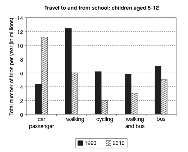- Task 1: (Bar chart) The chart below shows the number of trips made by children in one country in 1990 and 2020 to travel to and from school using different modes of transport. Summarize the information by selecting and reporting the main features, and make comparisons where relevant.