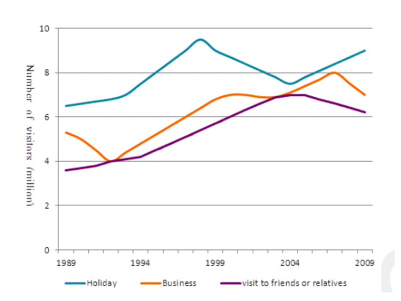 - Task 1: The graph below shows the number of overseas visitors who came to the UK for different purposes between 1989 and 2009. Summarize the information by selecting and reporting the main features, and make comparisons where relevant.