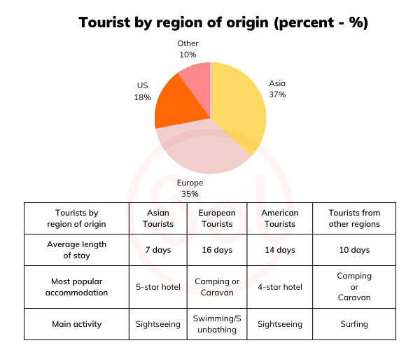 - Task 1: The chart and table below give information about tourists at a particular holiday resort in Australia. Summarise the information by selecting and reporting the main features and make comparisons where relevant.