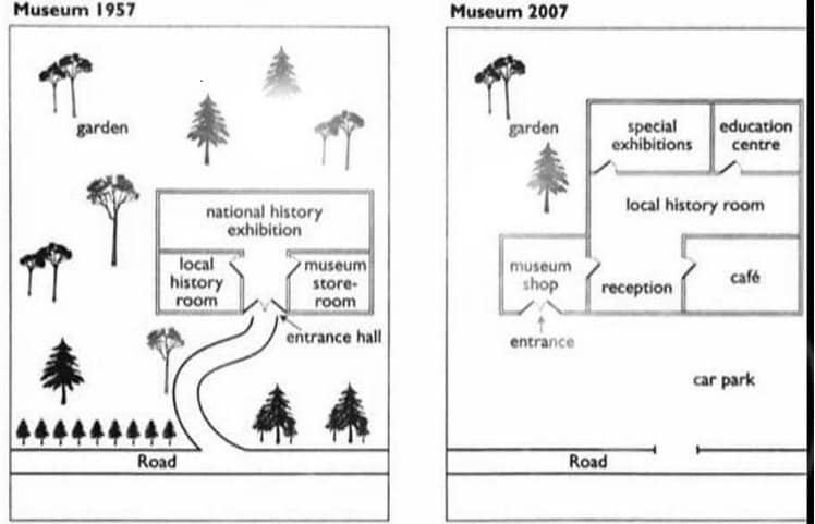 - Task 1: The diagram below shows a small local museum and its surroundings in 1957 and 2007.