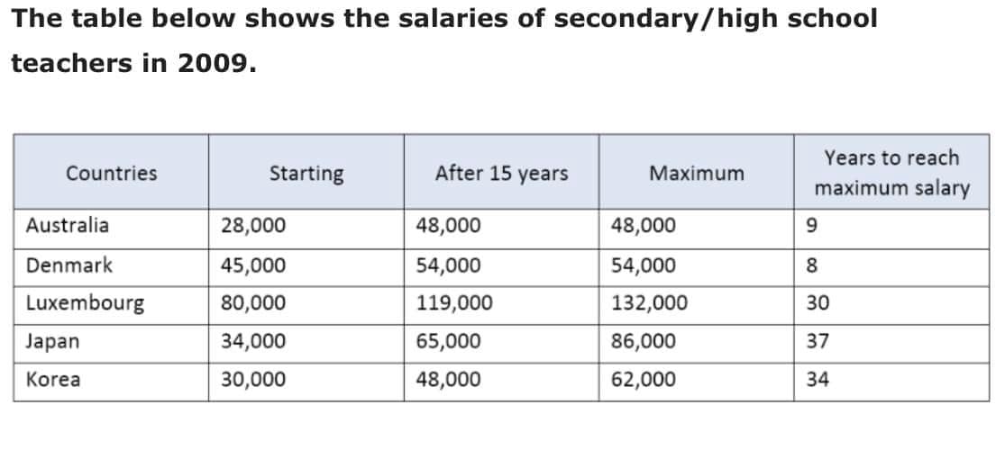 - Task 1: The table below gives information about salaries of secondary/high school teachers in five countries in 2009.