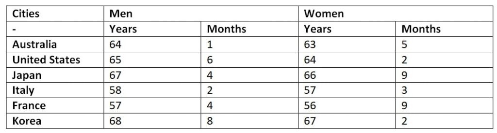 - Task 1: The graph below shows the average retirement age of males and females in six countries in 2003. Summarise the information by selecting and reporting the main features and make comparisons where relevant.