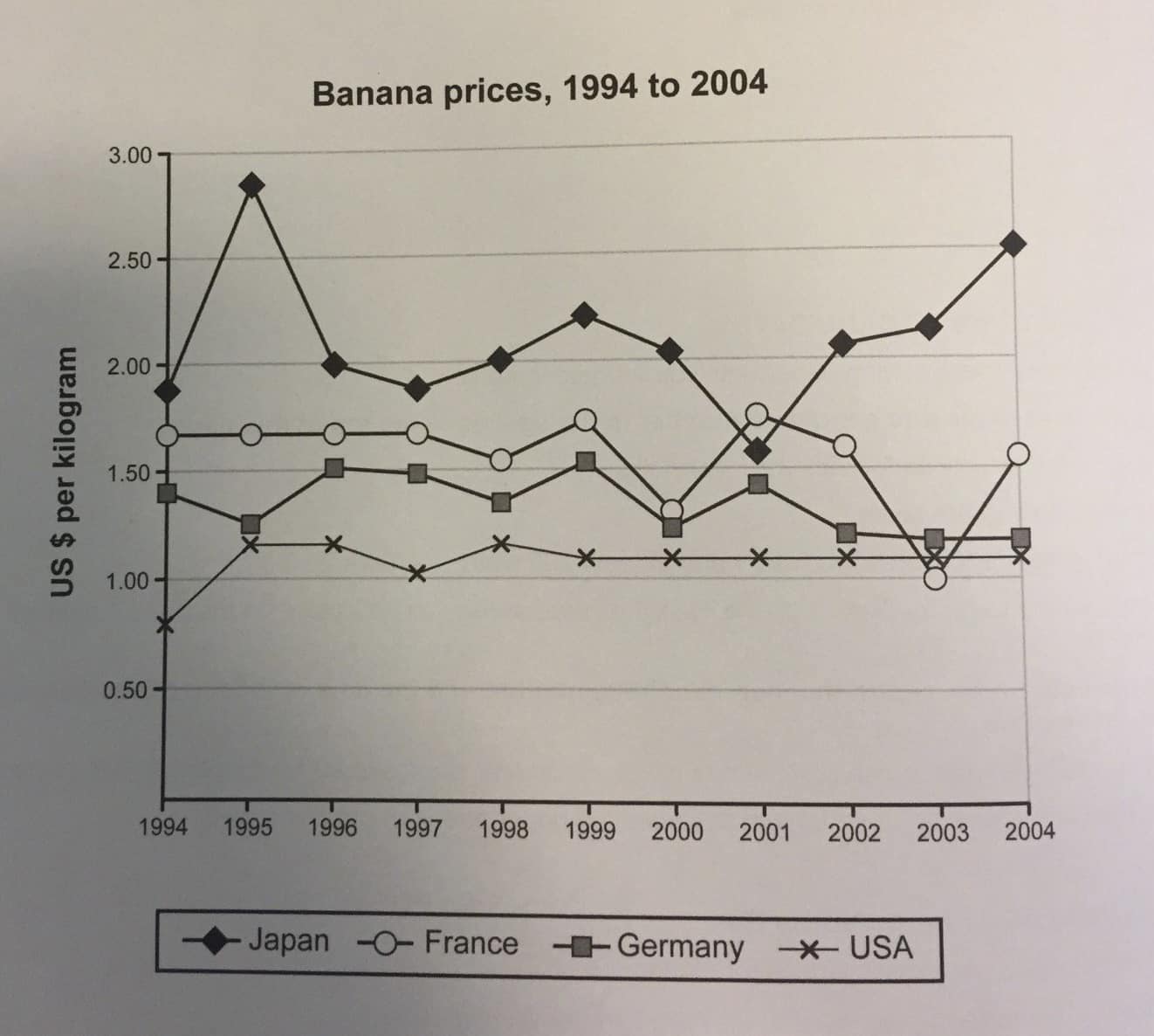 - Task 1: The graph below gives information about the price of bananas in four countries between 1994 and 2004.